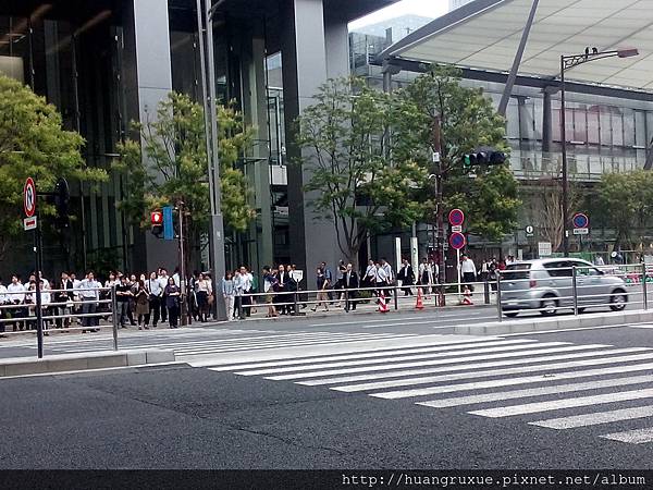 !這些上班族白襯衫大軍,我想在離開東京前,再到東京車站看看人潮,昨晚的車站周圍被燈光照的燦爛,路上滿滿都是計程車;白天的車站倒是恢復的該有的秩序,許多上班族趕著上班,男性們身穿襯衫或西裝,識別證跟公事包是基本配備