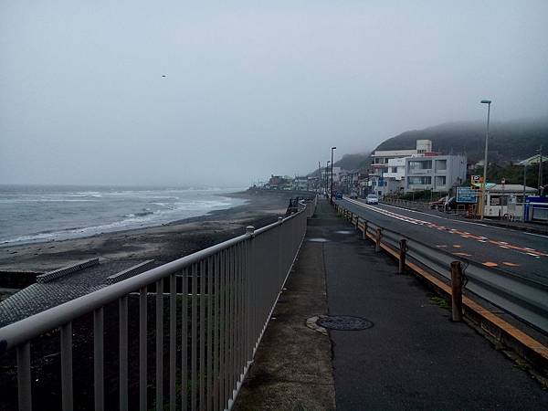 鐮倉地勢較高,下坡滑行很快我就到達"鐮倉海濱公園",看到相模灣海岸被颱風掀起的長浪,整個天空霧濛濛一片,還真是可怕