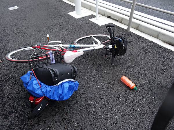 繼續前往小田原,134號國道有很好的人車分道,以防風林隔開海岸線,路線直人車又少,適合加速趕路,意外就在這時發生了,一恍神手把牛角勾到路旁燈柱,我整個人飛出去還前滾翻了一圈,但是安全帽跟手套保護了我,居然沒受傷,倒是著實吃了一驚,全身發抖!我告訴自己沒事沒事,要更小心,反省摔車的原因,重新拾起散落的行李,裝備後就繼續上路.