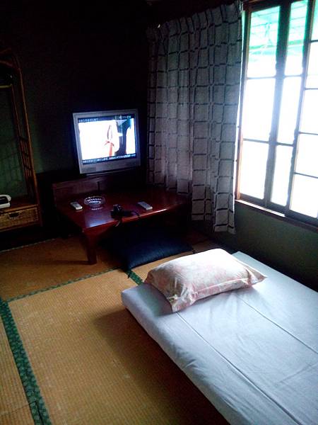 ?!我冒著大雨趕快回旅館,但是又在大豪雨中迷路,好不容易找到了旅館,內將婆婆跟他的女兒趕快出來接待我,看到我全身溼答答,要我趕快洗澡不然會著涼,婆婆還笑說我被它們強迫!(強迫的日文發音跟中文相似).這天是我第一次住在傳統日式旅館,好大的房間撲滿整片的塌塌米,一個簡單的小茶几,日式的公共浴室,一切都好滿足,在這個颱風天裡,我能這麼順利地找到旅館.