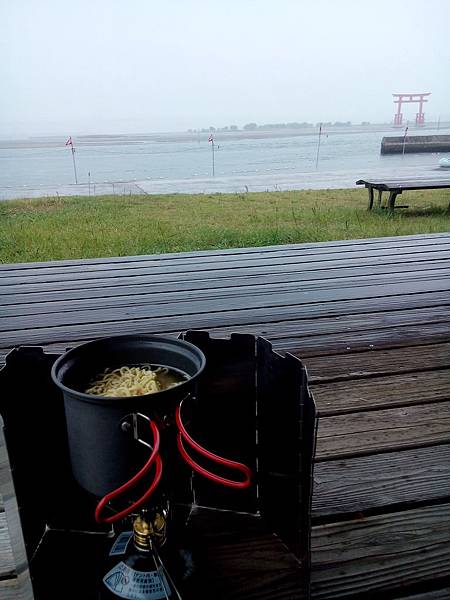 不到10點,天空放晴,我又進入東海道準備前進濱名湖,在之前我發現了"辦天神社",就只是一個小神社,但後面一是大片海灣(遠洲灘),海岸線上居然有座"紅色鳥居"在海裡,原來這裡是弁天島海濱公園!遠方有優美的跨海大橋,岸邊有類似紮營用的屋簷木棧,有遊客在日光浴,也這裡太美了,太舒服了.