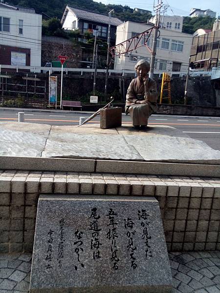 尾道女作家,林芙美子望著海邊的石雕,尾道車站附近有她舊居展覽館!