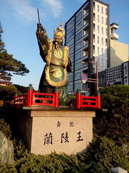 宮島口車站外有一個蘭陵王!他的面具好可怕喔!