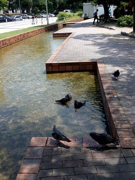 大濠公園外環濾水溝渠,使的湖水非常乾淨,水道的水也乾淨,連鴿子都下去玩水啦!我靠他們很近拍照,鴿子完全不怕人...