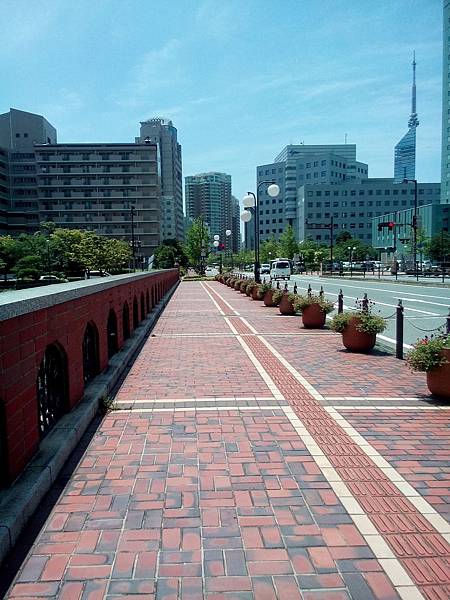 前進福岡海濱公園,耶!福岡塔就在前面喔!!好大的馬路,行人單車道跟汽車道一樣大,很尊重行人路權!