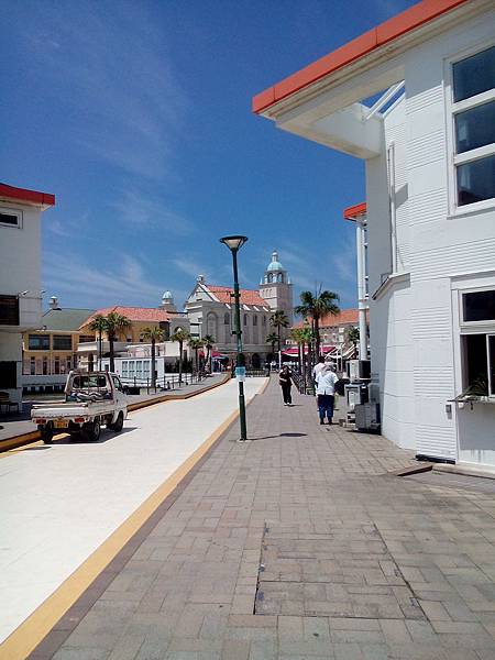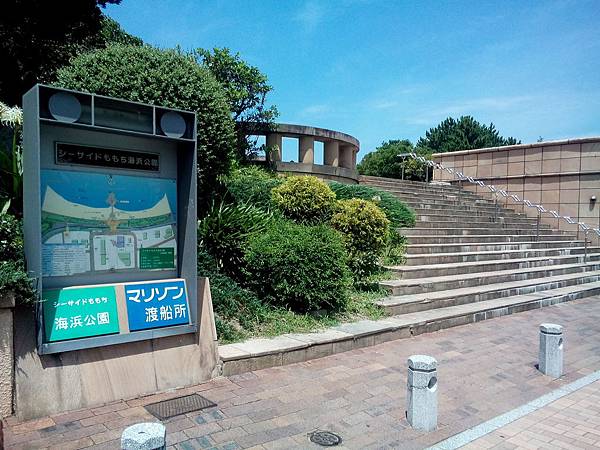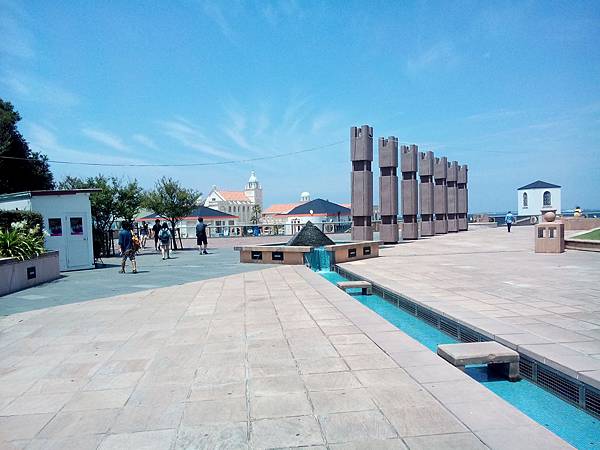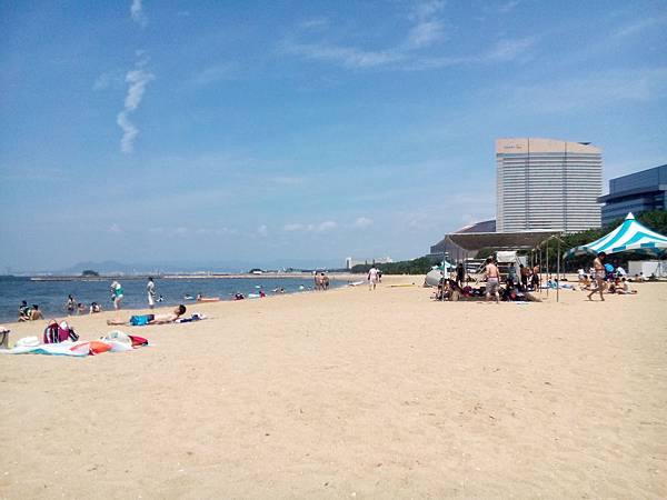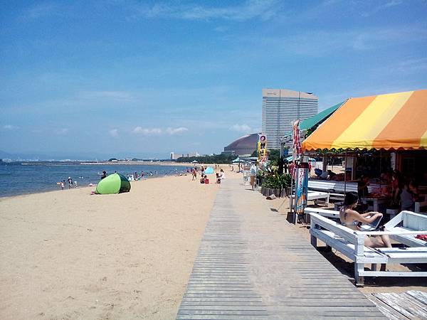 離開很美的大濠公園,接著到鄰近福岡塔的"福岡海濱公園",這個具規模河濱公園有特別設計,有很美的建築,土黃色小城配上盡頭藍色的海濱教堂,沿途有白色商店賣冰,BBQ,紀念品,好繽紛熱鬧;沙灘區有規劃沙灘排球,還有海上摩托車停放處,沙灘上也有設有涼亭,在中午12點居然很多人在日光浴,真令我吃驚,我也在這裡發呆放鬆觀察日本人.