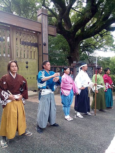 我們先到熊本城旁的"加藤神社"繞繞,爺爺對神社似乎很稀鬆平常,沒有入神社,也沒拜拜,我們趕在"熊本城"開門之前到達,居然看到了"武士隊"在迎接觀光客,準備開城啦!大家一起聽從武士口令喊口號,好好玩喔!有日本爺爺當嚮導就是不一樣,我可以仔細觀察城堡,爺爺也介紹歷史,來了日本看了10幾座城堡,第一次可以有人詢問!