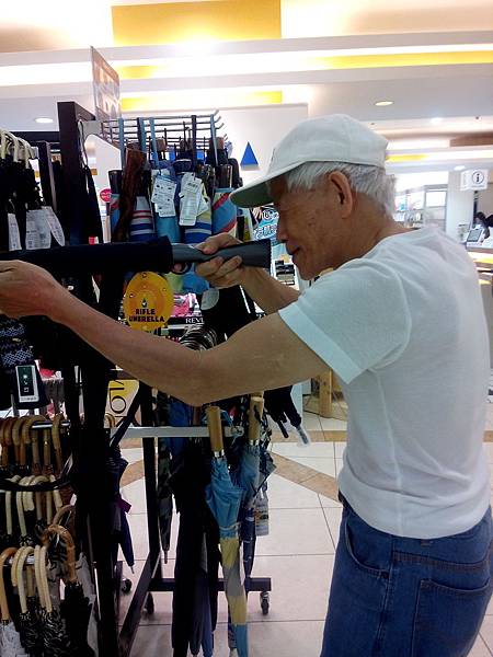 晚上為了要等適合的時間回"快活club"休息,爺帶我到百貨公司看看稍作休息,調皮的爺爺拿了手槍型雨傘射擊,被我拍下了這張可愛的照片