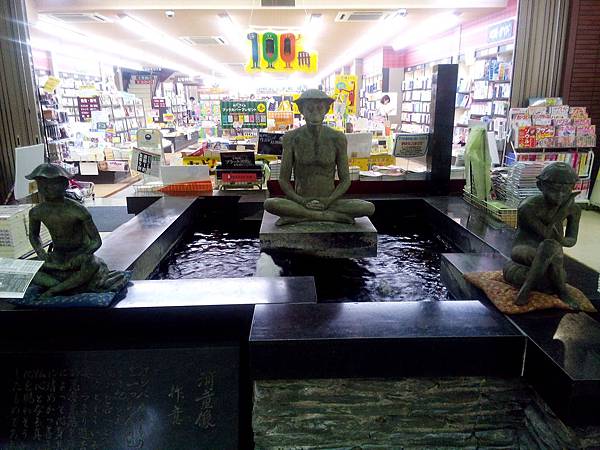 晚上我們依然在這條商街參觀,書店前有河童(かっぱ,kapa)像,真是長的很醜,很可怕,爺詳細的向我介紹かっぱ,說河童最喜歡吃小黃瓜(きゅうり,kyuli),會偷吃農民的小黃瓜,沒有頭髮,頭上有一片葉子裝水才會元氣十足,如果沒有水就會枯死,生活在河邊,很會游泳!真是一個奇怪的生物,妖怪,鬼怪
