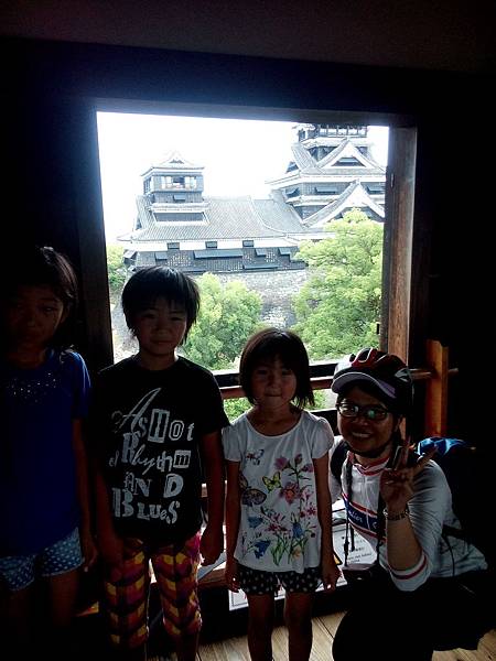 熊本城有三個天守閣,城內的城橹,占地很廣大,我跟爺爺真的很漫遊熊本城,我們欣賞"御殿",爺還模仿忍者在榻榻米上滑行跟射飛鏢,真是有夠調皮的,到了頂樓我巧遇從台灣來自助旅行的一家人,他們從安全帽上中文字發現台灣人,知道我想上阿蘇後,一直擔心力勸我天氣很差,真的要小心,他們才剛從阿蘇過來,還看到車禍,唉....真讓我擔心上阿蘇的事!!