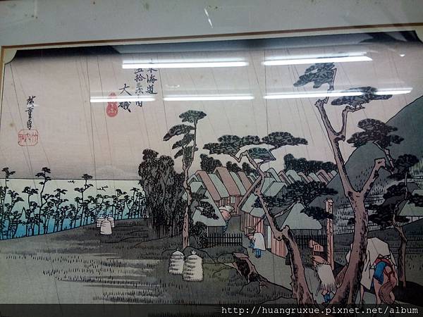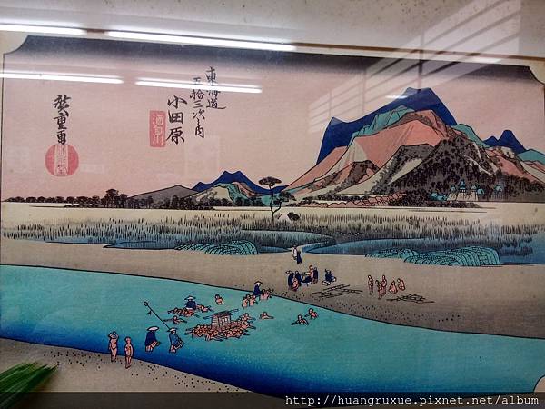 店內有兩幅浮世繪,東海道五拾三次,在小田原處,浮世繪是由作者,雕刻師,上色印刷師,共同的作品!