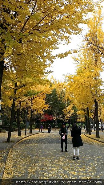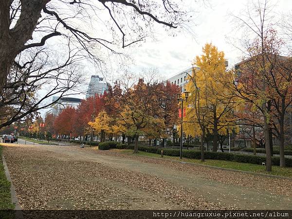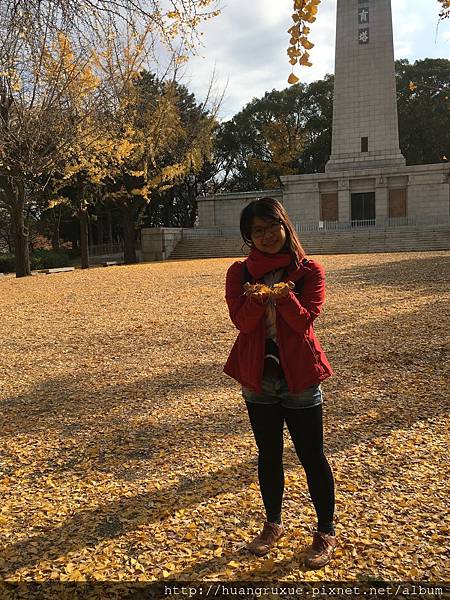 大阪城公園的一偶,教育塔周圍種滿了銀杏,大家都在這邊拍照,這時跟著別人準沒錯。![]()
