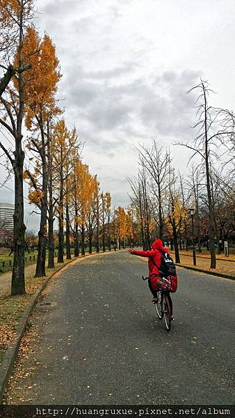 ,還有穿插紅色、棕色的楓葉,護城河保護著大阪城,河面倒影著藍天,大阪城公園這裡一直是我最喜歡的大阪景點,沒想到12月初居然有這番景致,原本以為這個時間點楓葉什麼都凋謝了,所以非旺季,這美景真的好意外,好幸福這一切很美好,一路都很平安,假日的公園許多市民在這邊騎單車、慢跑、甚至看到一大群7-10歲的小朋友隊伍慢跑,每個小朋友跑得臉紅通通,卻依舊賣力,我們悠閒的單車漫遊,或停或走,享受這片刻美好,這時候北鼻跟我說感謝我帶他來這裡,他非常喜歡,這時我也感到努力安排總算是雙方都開心
