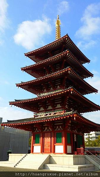 在不遠的四天王寺是我安排的景點,四天王寺是日本大阪最具有歷史的一座寺廟,早在聖德太子推崇佛教之時(西元6世紀),在大阪四天王寺、奈良的飛鳥寺所建立的佛寺,佛寺就是佛寺,肅穆莊嚴禁止喧嘩,大殿裡沒有過多的現代燈飾,顯得昏昏暗暗的,大殿裡有兩尊很大的佛像,四面的牆則是繪上佛祖成佛的過程,因為歷史都顯得斑駁,牆面也有龜裂的痕跡,但仍看得出日本用心的維護且為了保護遺跡全面禁止拍照,日本的寺廟有非常多的五重塔、三重塔,除了外觀很美之外,我從沒上去過,第一次踏上四天王寺的五重塔,原來這裡是一個上千上萬的靈位塔,依照日本年號姓氏排列有大大小小的靈位,我們依著旋轉樓梯上到五樓,想一探居高臨下之感,卻沒想到是包裹起來的,沒有景觀,只有一個中心塔,供俸著舍利子,但舍利子還是被保護包裹著,就是什麼都看不到,大概也是只要上來一次的塔