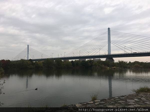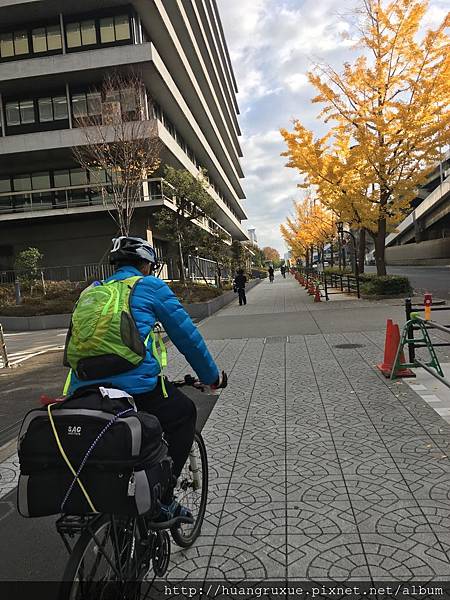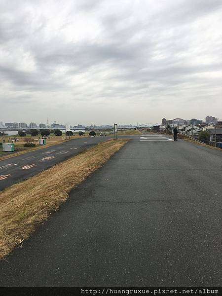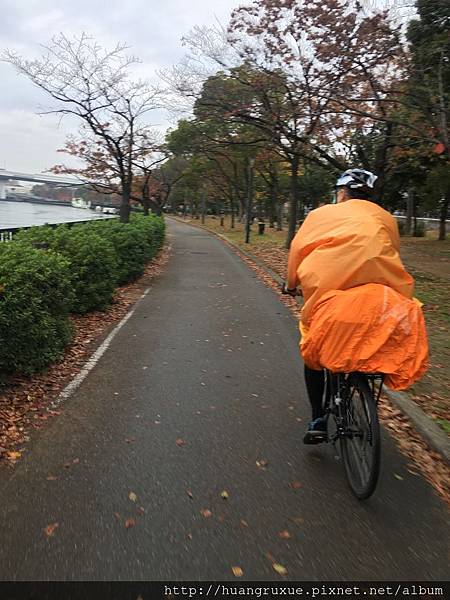 一點半要上路了,即將離開大阪市區,毛毛雨就微調裝備,很悠閒的河邊單車道。![]()